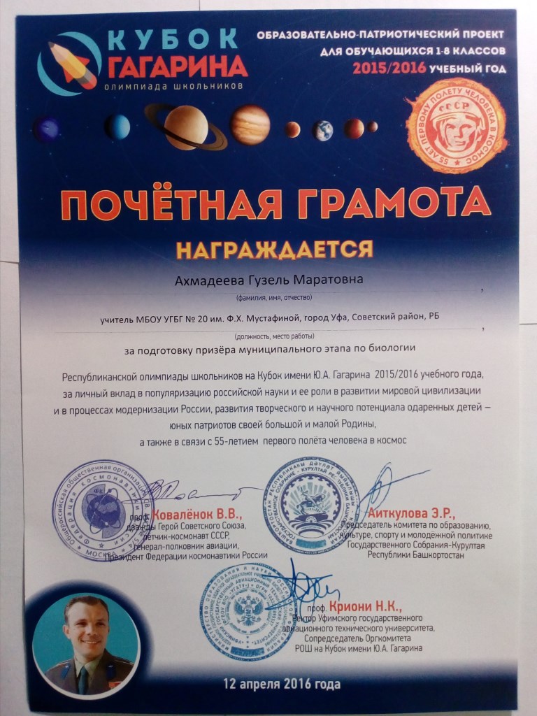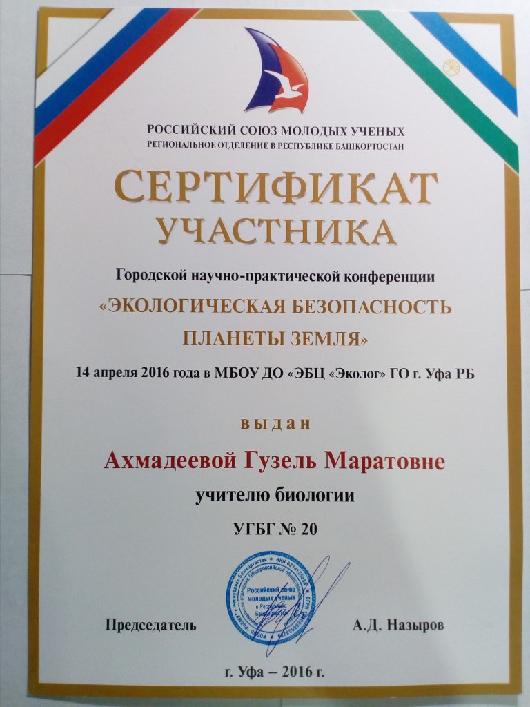 Ахмадеева Гузель Маратовна, родилась 21.07.1985 г. в Миякинском районе, с.Киргиз-Мияки. Окончила МОУ СОШ №1 им. М.Абдуллина с. Киргиз-Мияки. Поступила в СГПА «Стерлитамакская государственная педагогическая академия» на специальность «учитель биологии и химии». Сразу после окончания, трудовой стаж начала с 2007 года в должности учителя химии в МБОУ СОШ №7 Советского района городского округа г.Уфа РБ. С 2010 по 2016 гг. продолжила свою трудовую деятельность в МБОУ УГБГ №20 им.Ф.Х.Мустафиной Советского района городского округа г.Уфа РБ в должности учителя биологии.